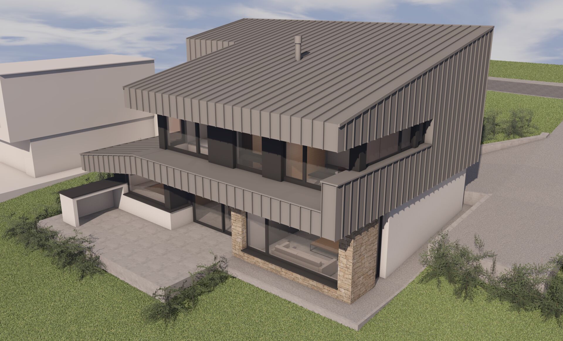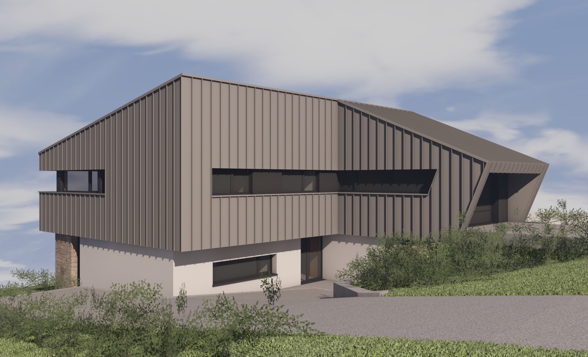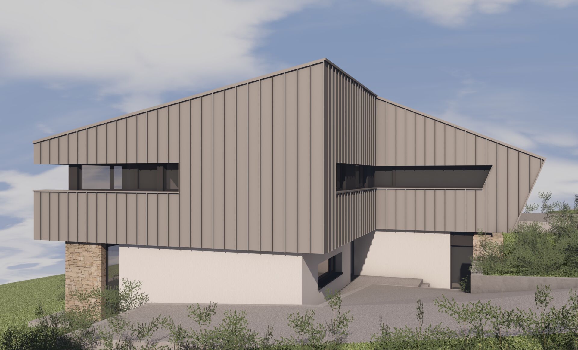 Les teintes sont neutres : grès sinémurien, bardage en zinc gris clair et crépi blanc cassé de gris.