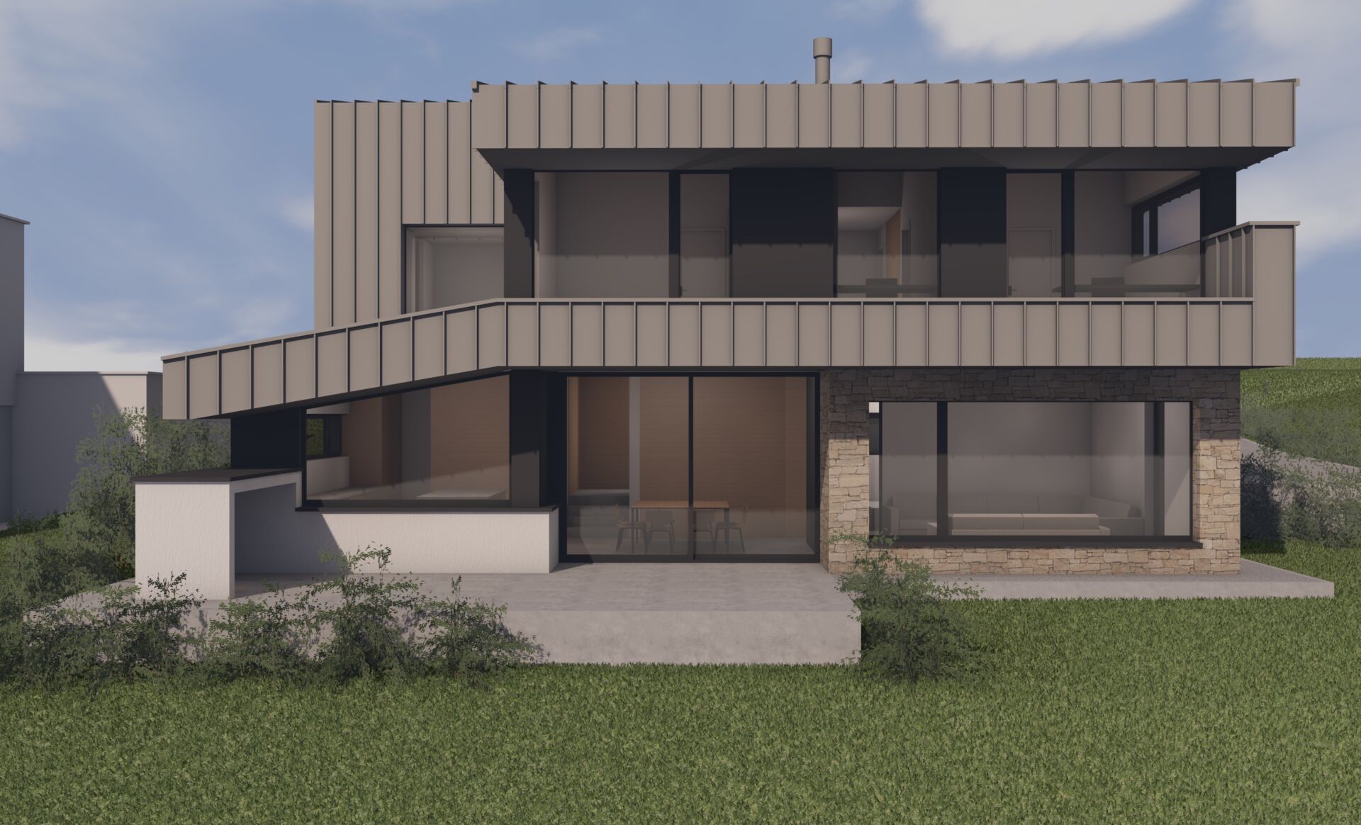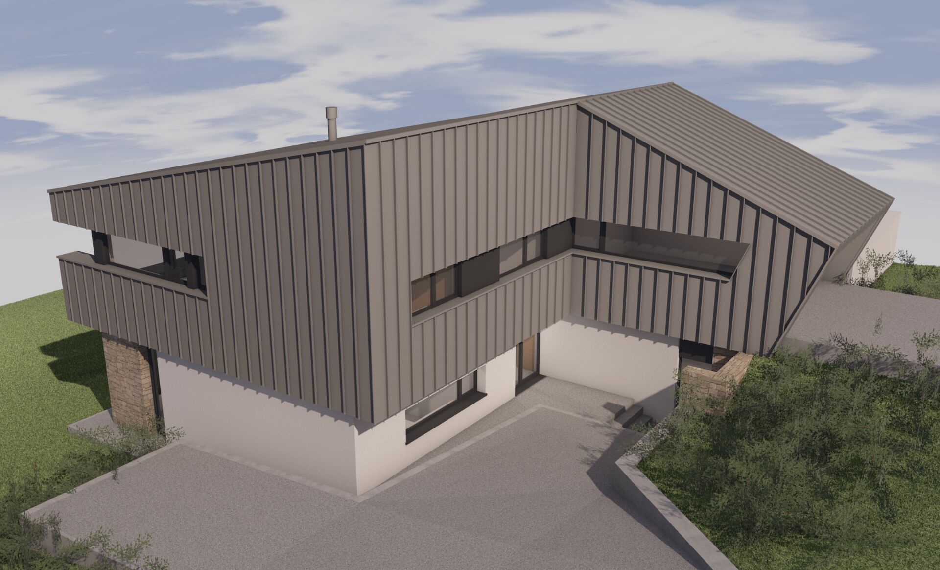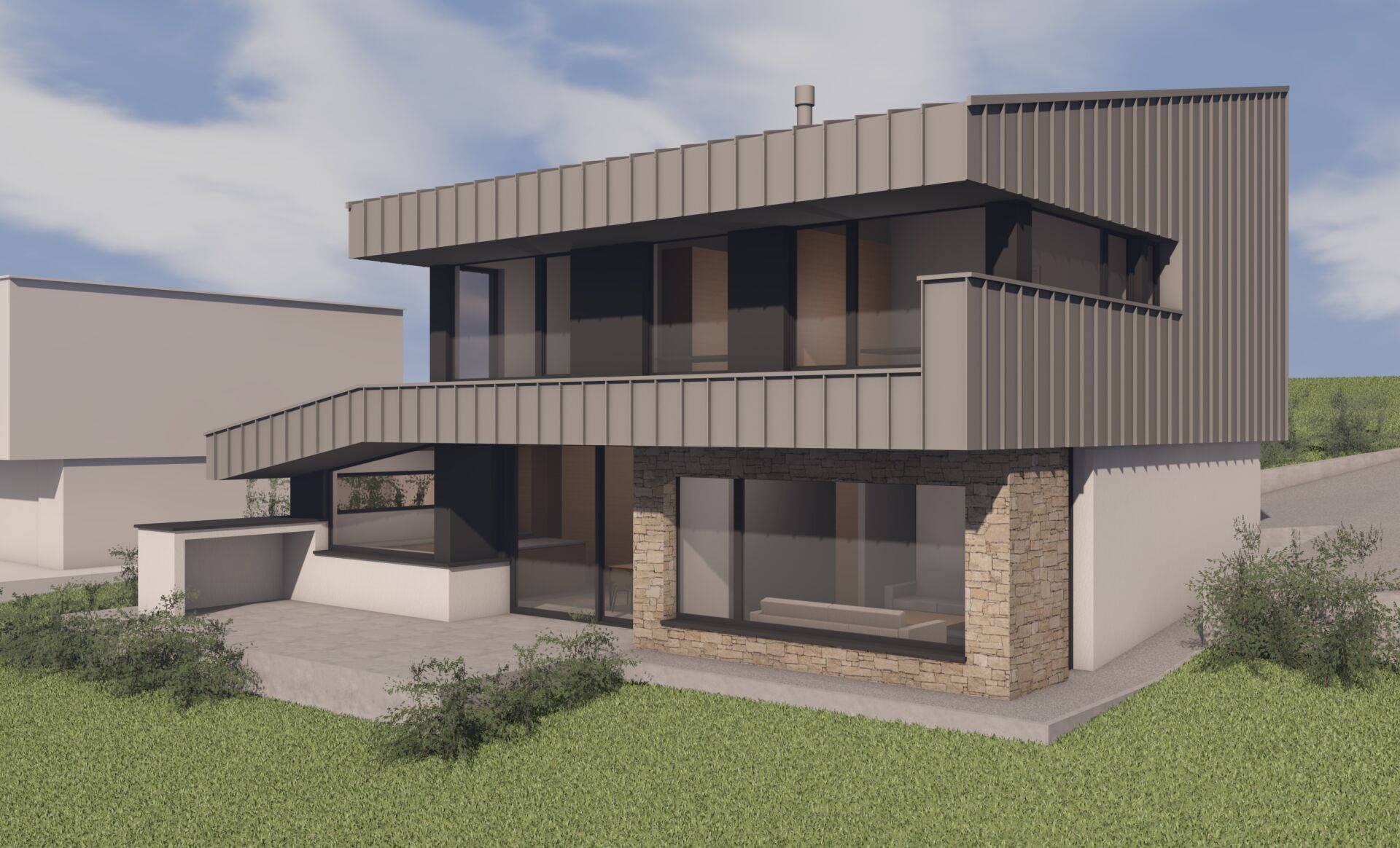 Les teintes sont neutres : grès sinémurien, bardage en zinc gris clair et crépi blanc cassé de gris.