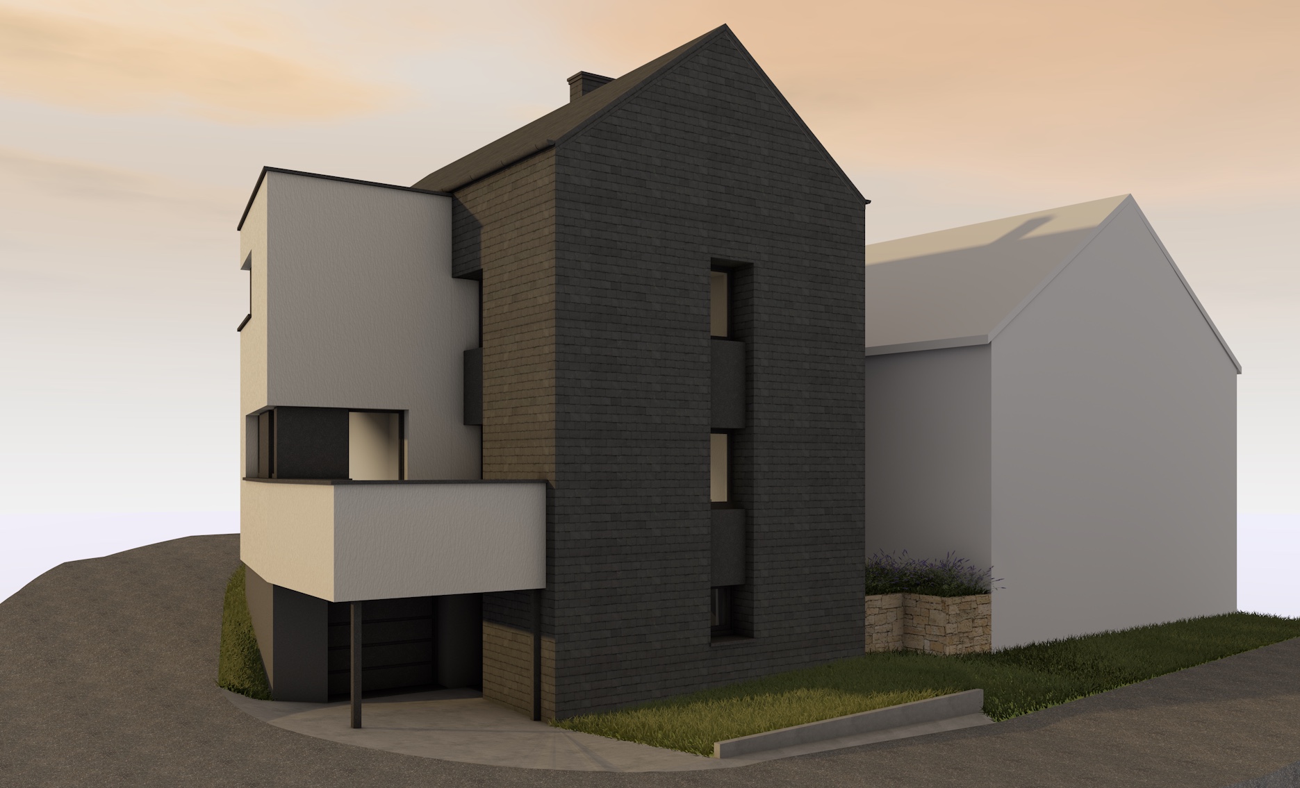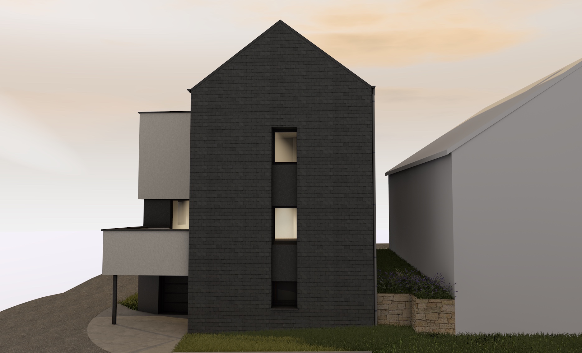 Les volumes sont mis en évidences par le choix de matériaux contrastés mais courants : l’ardoise et le crépi.